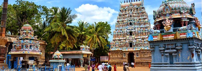 Sri Naganathaswamy Temple is one of the 9 Navagraha Temples around Kumbakonam and is dedicated to Rahu. The temple has a separate shrine for Rahu. Here Rahu Bhagawan can be seen with his two consorts Nagavalli and Nagakanni together. Sri Naganathaswamy Temple is one where Lord Shiva was worshipped by Rahu and got relieved of a curse. A unique feature of the temple is that Rahu Bhagawan is seen with human face. Usually in other places, Rahu is seen with a serpent face. The Thirunageswaram Temple has vast prakarams, towering gopurams, and several mandapas. There are four entry towers with fort like walls which surround the outermost prakaram. The Vinayaka temple, Balipeetam, and Nandeeswarar Mandapam are seen on the eastern gateway. Lord Rahu’s idol is placed in the south-west corner. The southern side of the temple has a water head with four mandapas, surrounded by a 100 pillar mandapam in a temple-car style. The mandapam is decorated by artistic pillars in all directions.
